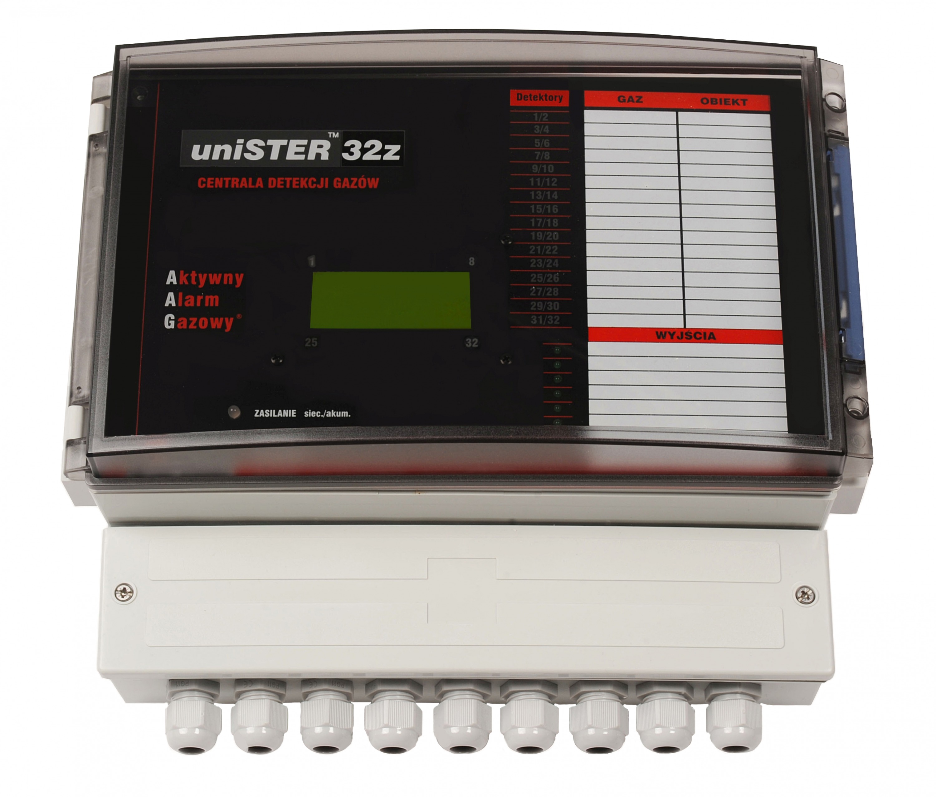 Centrala alarmowa „uniSTER32z/RS485 ” jest nowoczesną, mikroprocesorową jednostką centralną przeznaczoną do pracy w systemach wykrywania (detekcji) gazów wybuchowych i toksycznych. Jest elementem systemu Aktywny Alarm Gazowy służącego do aktywnej ochrony różnorodnych obiektów przed wybuchami gazów i oparów, umożliwiającego wykrywanie gazów, sygnalizacje i alarmowanie oraz sterowanie zaworami odcinającymi dopływ gazów. Centrala alarmowa „uniSTER32z/RS485 ” służy do współpracy (zasilania i kontroli) z detektorami o napięciu zasilania 12V, maksymalnym poborze prądu 250mA i wyjściu RS485 (protokół Modbus RTU).